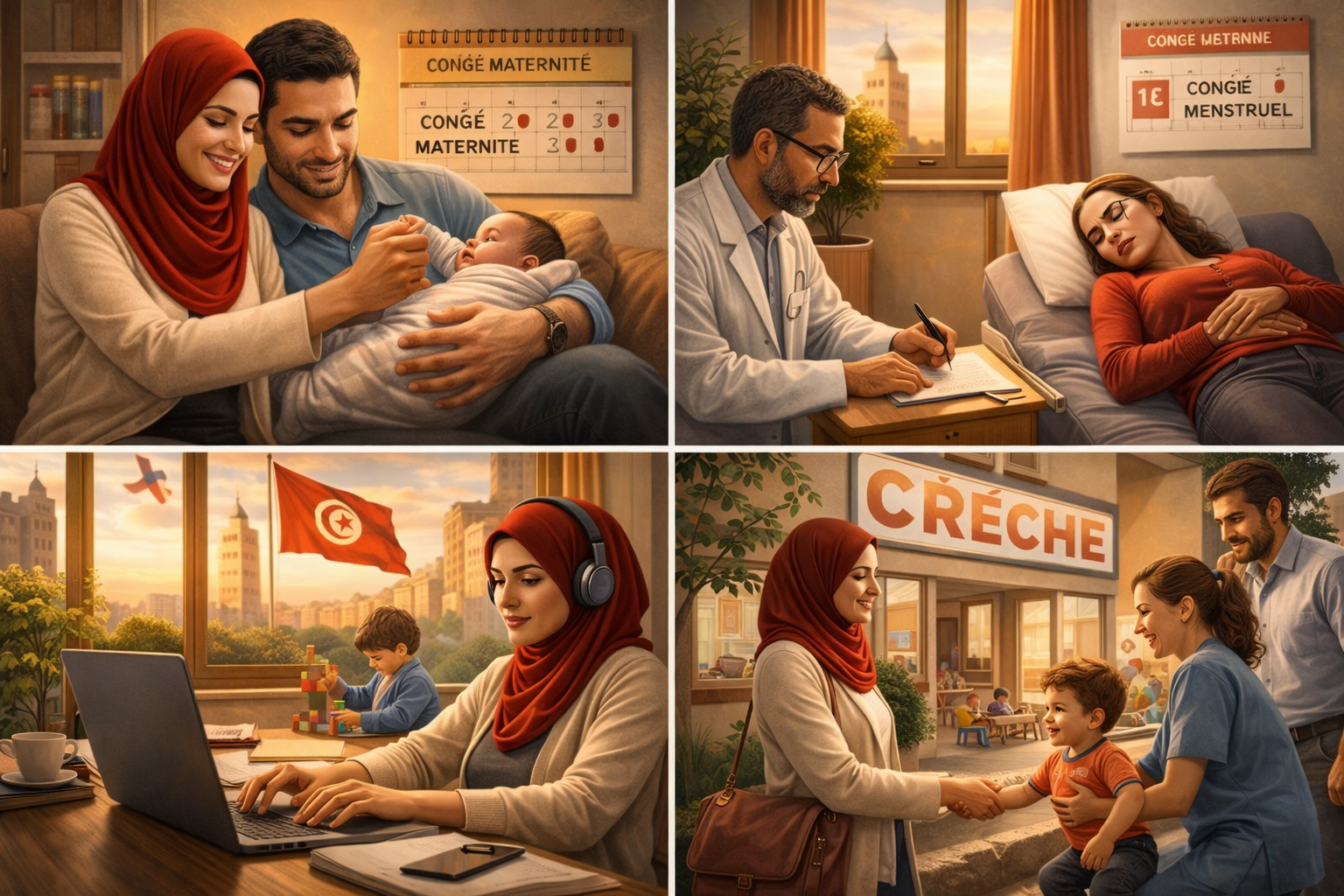 حقوق النساء في تونس من خلال صور تمثل إجازة الوالدية، إجازة الحيض، العمل عن بعد ورعاية الأطفال