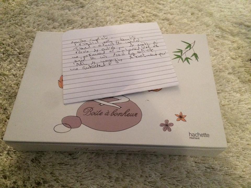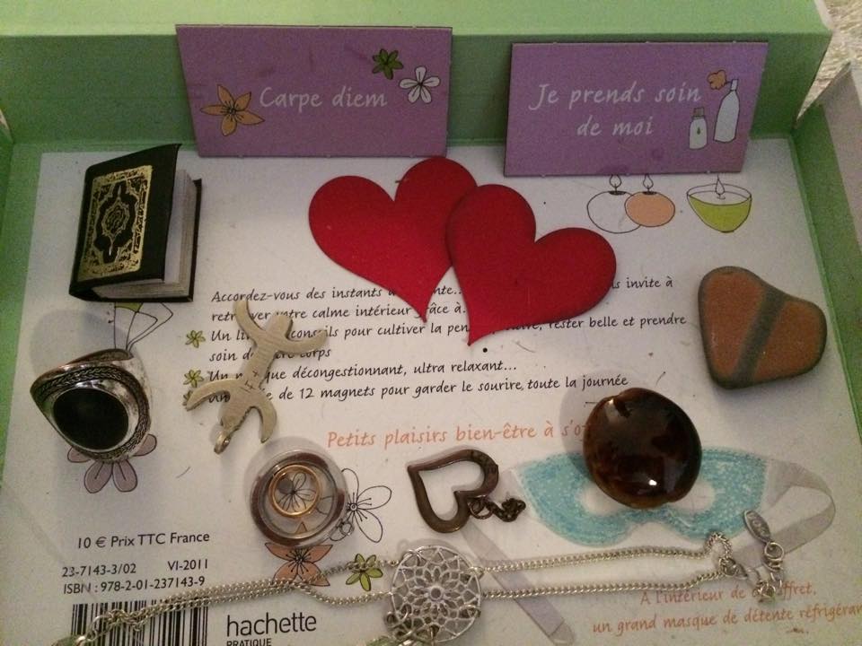 C’est ma boite à bonheur. Littéralement. Mes enfants me l’avaient offerte pour la fête des mères, l’an dernier. Dans cette boite, je mets mes jolies petites choses qui me rappellent que la vie vaut la peine d’être vécue.
