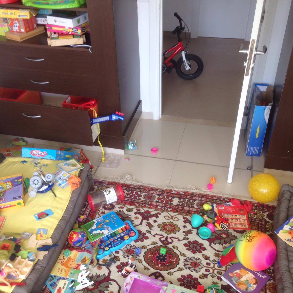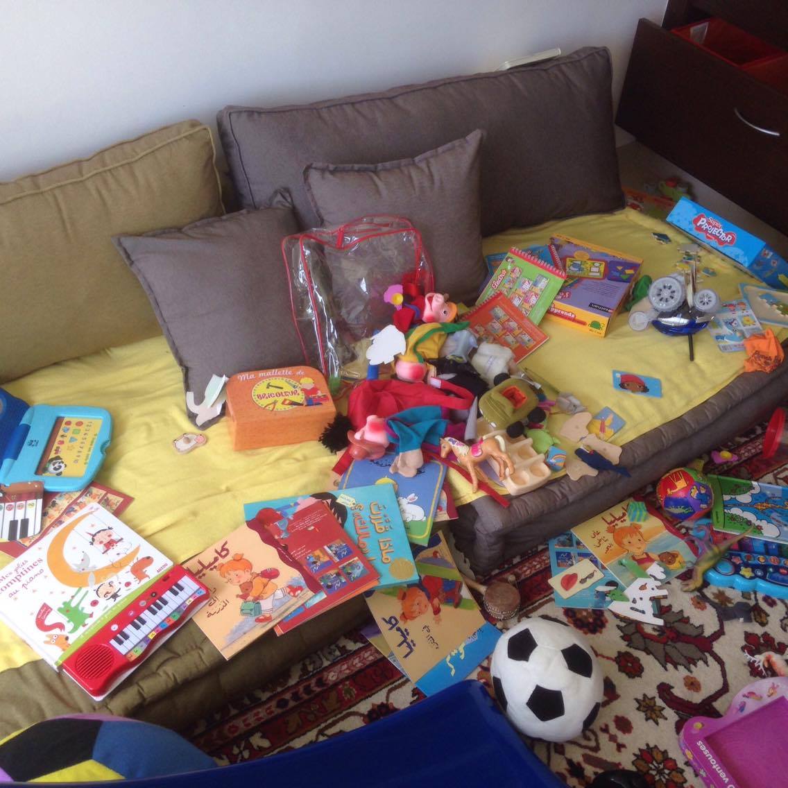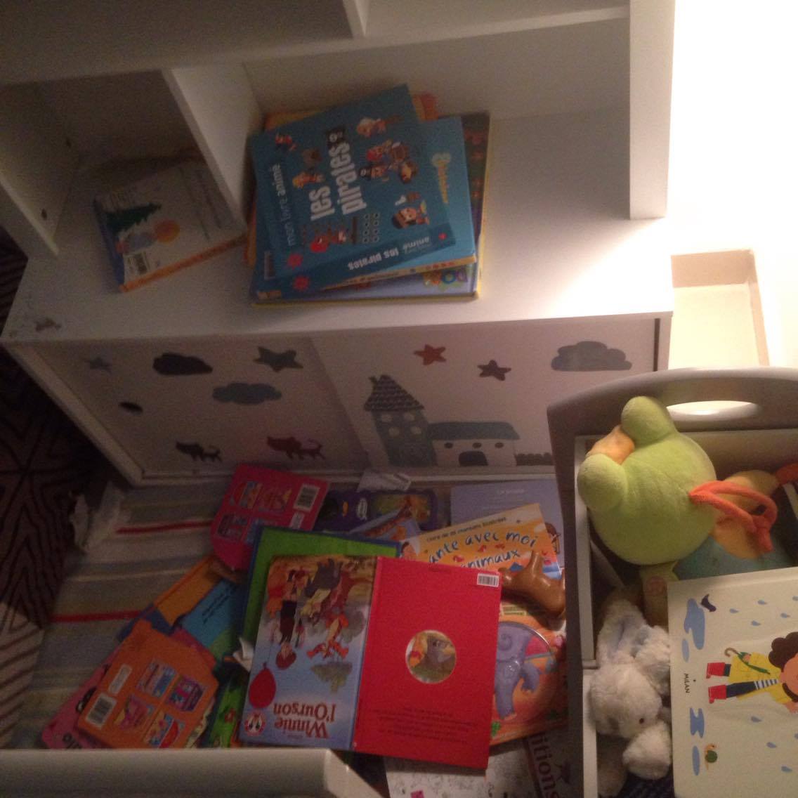 Je commence par ramasser tout ce qui traîne par terre : mouchoirs, lingettes, linge sale, chaussons, chaussures, jouets, stylos, des fois même des ustensiles de cuisine. Je laisse le plus terrifiant à la fin: la chambre à jouets!