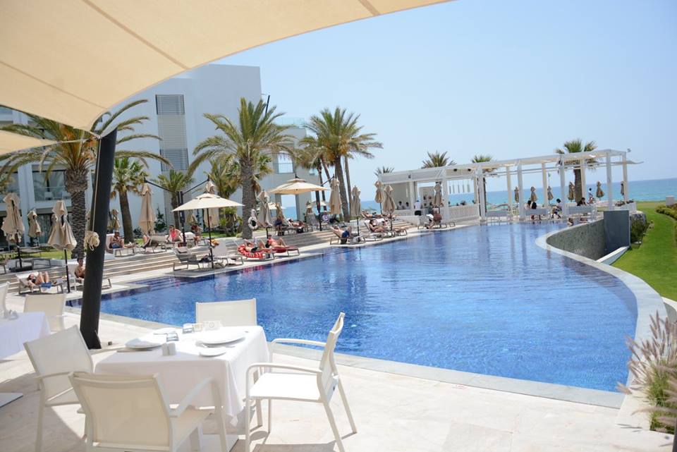 Les murs en marbre Kadhel gris-rose, de la mosaïque au sol, de grands espaces, des hammams, des cabines à la fois luxueuses et avec un cachet antique, des soins très particuliers comme celui du flotarium, premier en Afrique, qui reprend le principe de la mer morte, avec une eau tellement salée qu’on n’a presque plus de poids. N’oublions pas la grande piscine chauffée à moitié couverte, l’autre moitié en plein air avec une vue incroyable sur la Méditerranée.