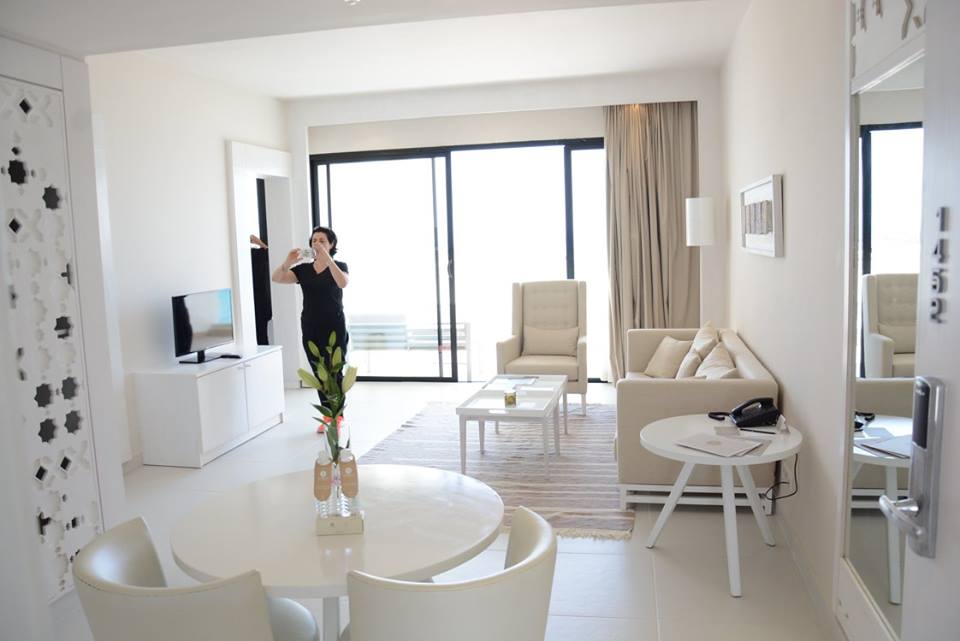 La Badira ressemble à un bateau flottant sur la baie de Hammamet, toutes voiles dehors, blanc, lumineux. D’ailleurs les chambres donnent toutes soit sur le lever du soleil, soit sur le coucher. La notion de lumière est omniprésente.