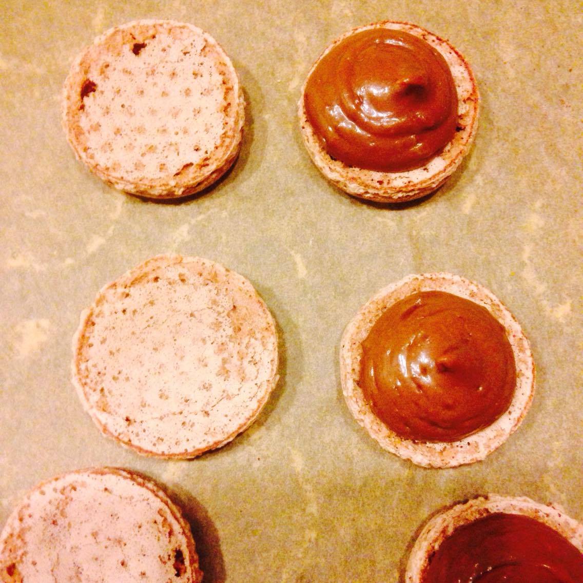 4. C’est le moment de creuser l’intérieur des coques avec le pouce( 5 min après) : ceci vous permettra non seulement de les garnir plus généreusement, mais surtout vous facilitera la tâche, car il est plus facile de disposer de la ganache lorsque les macarons ont été creusés. Celle-ci restera mieux en place, et ne coulera pas.