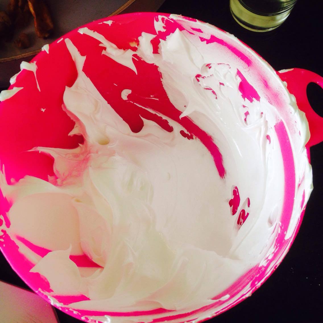 6. Dans son livre « Macarons », C. Felder, conseille de rajouter du colorant à la meringue. On peut aussi diluer le colorant (une pointe de couteau de poudre ou une pointe de cure dent dans le gel) dans les blancs restants.