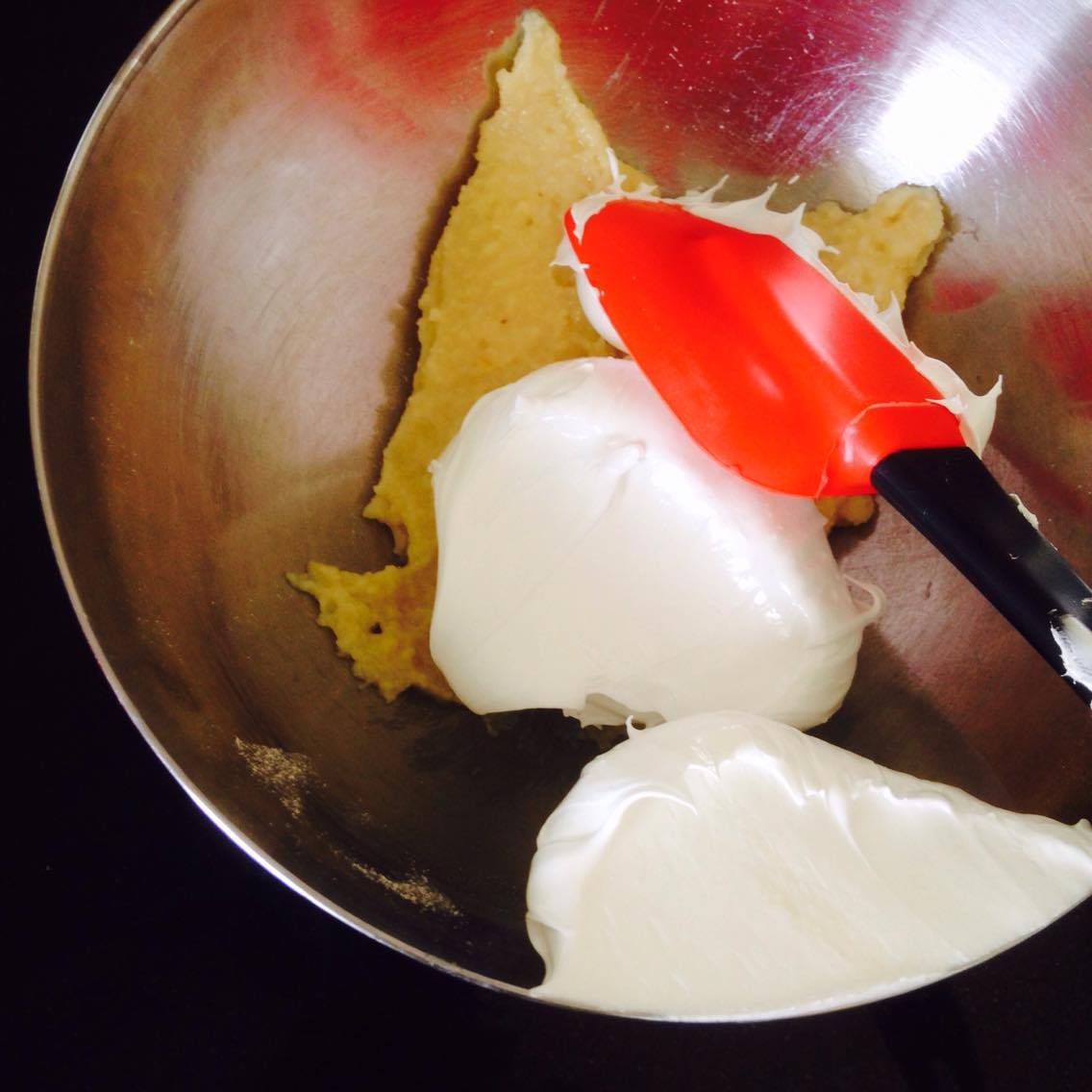 1. incorporez tout d’abord une petite quantité de la meringue dans la pâte d’amande, pour bien la détendre : (vous pouvez également macaronner au robot, en utilisant la feuille, je ne le fais jamais mais Mercotte le recommande, donc c’est possible). Incorporez en 2 fois la meringue à la pâte d’amandes, en faisant des gestes circulaires, et en soulevant l’appareil.