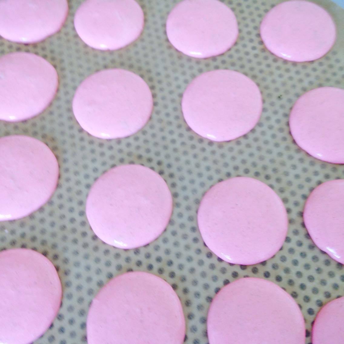 11. dressez en quinconce les macarons sur du papier sulfurisé posé sur 2 plaques superposées.LES PLAQUES SUR LESQUELLES VOUS ALLEZ LES FAIRE CUIRE DOIVENT ÊTRE FROIDES !!!! (à température ambiante). Prenez ensuite la plaque dans vos mains, soulevez-la bien du plan de travail, et relâchez-la. Ceci a pour but de bien aplatir les macarons. Renouvelez l’opération deux ou trois fois