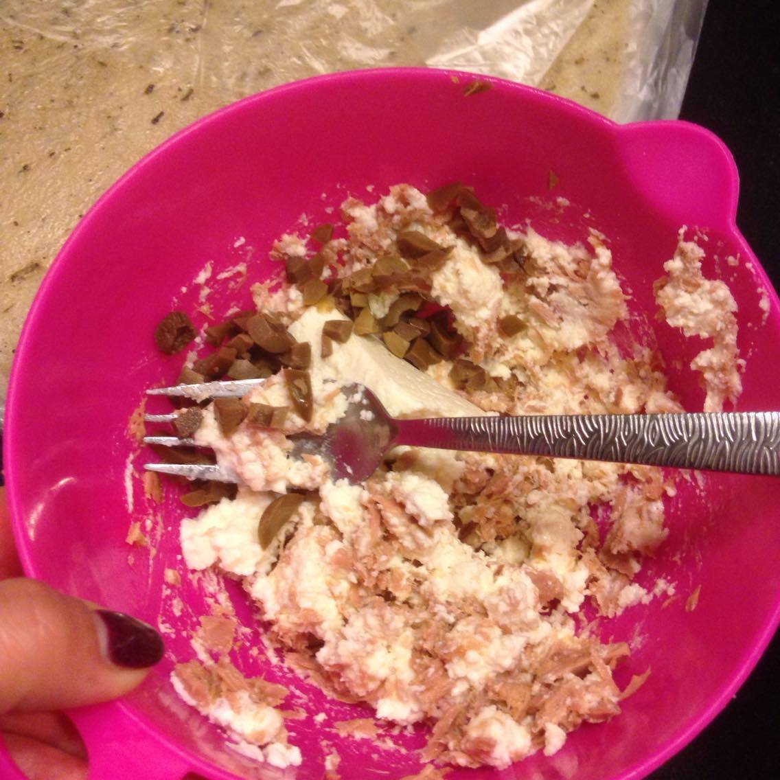 3. Dans un bol , mélanger ricotta , olives découpées en petits morceaux et thon émietté.