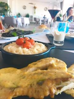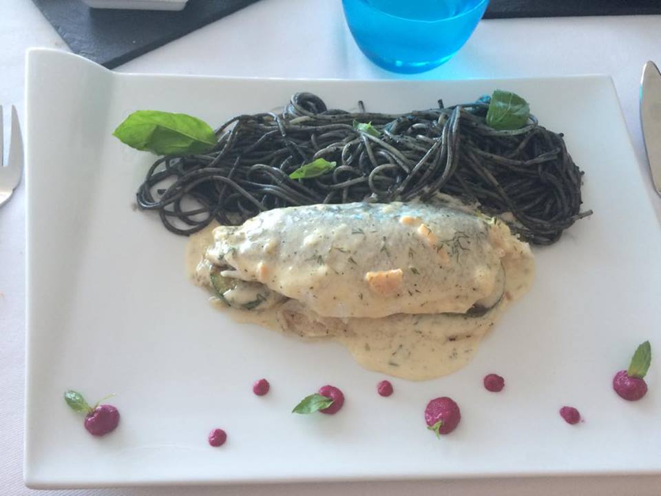 On a commandé un mille feuille de loup au saumon avec des pâtes à l’encre de seiche (36 dinars) et des filets de Saint-pierre au beurre d’orange (35 dinars) et en dessert un fondant au chocolat à l’orange et au gingembre (14 dinars) orgasmique!