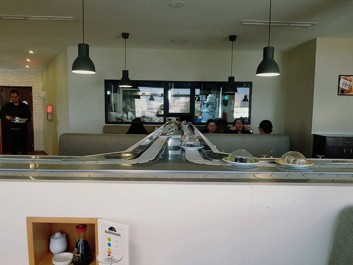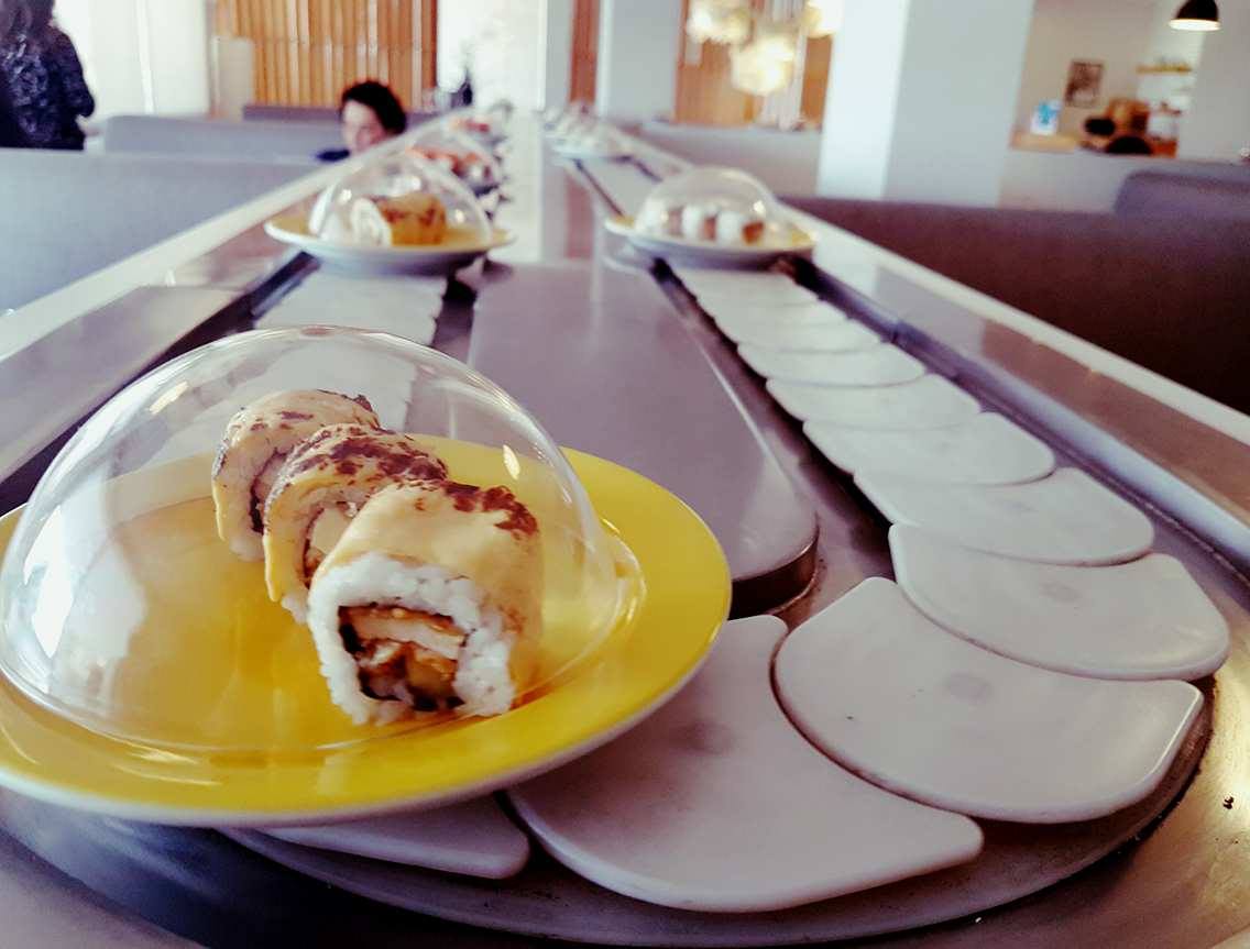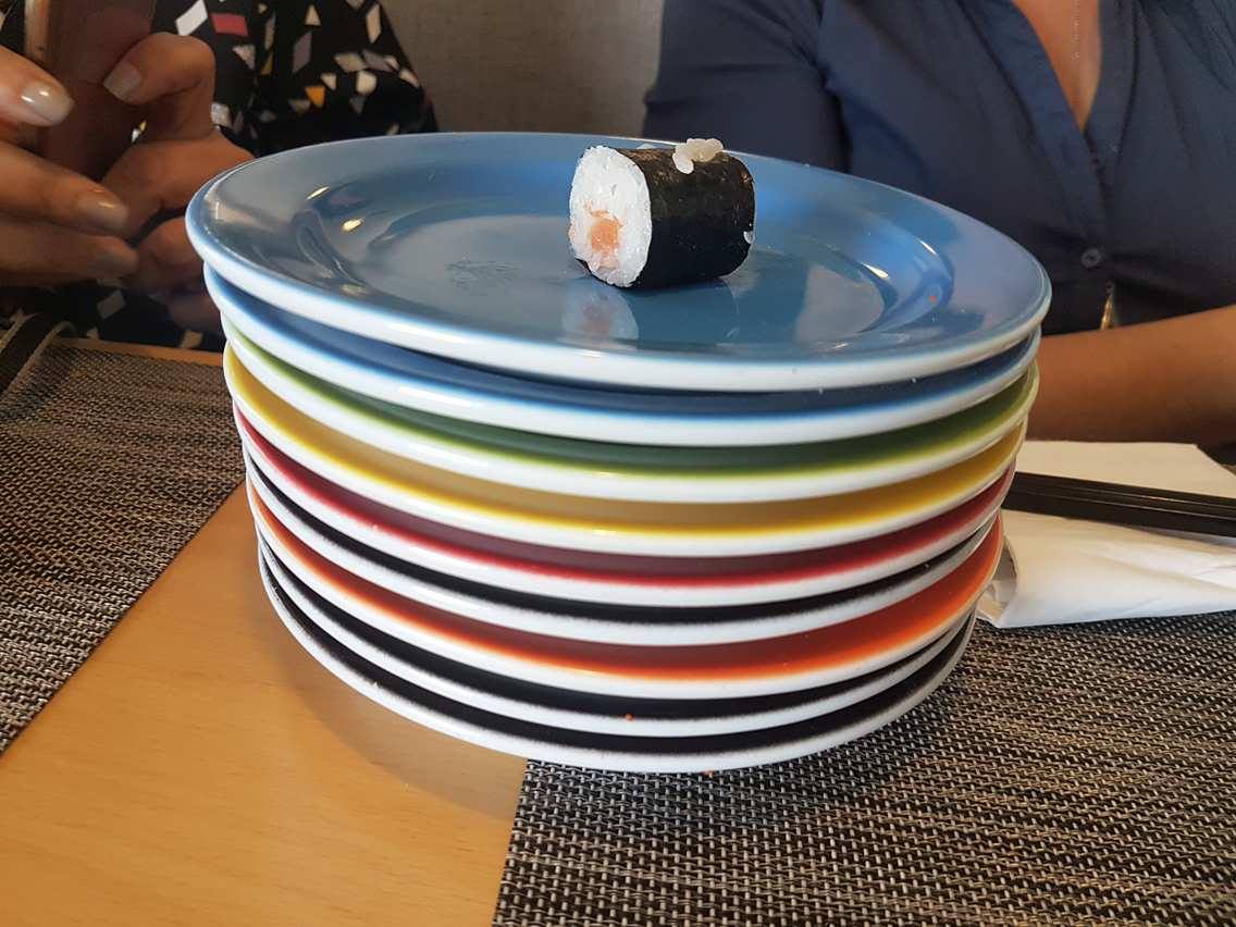 Le système du buffet est très sympa. C’est une espèce de tapis roulant qui amène chaque fois les plats de la cuisine jusqu’aux tables. On n’a qu’à tendre la main pour se servir. Ce sont des petites portions de 3 pièces placées dans des assiettes de couleur différente, chaque assiette correspondant à un prix. Pour l’addition, il suffit d’additionner la valeur des assiettes.