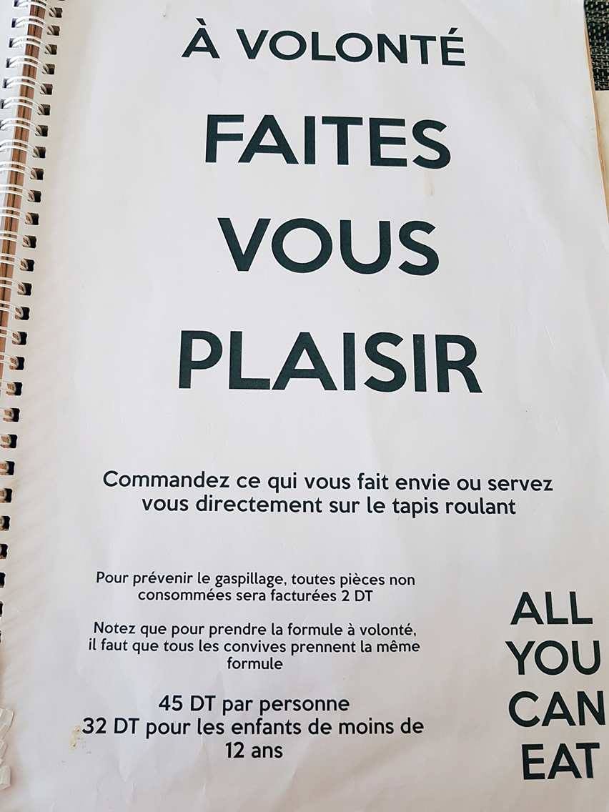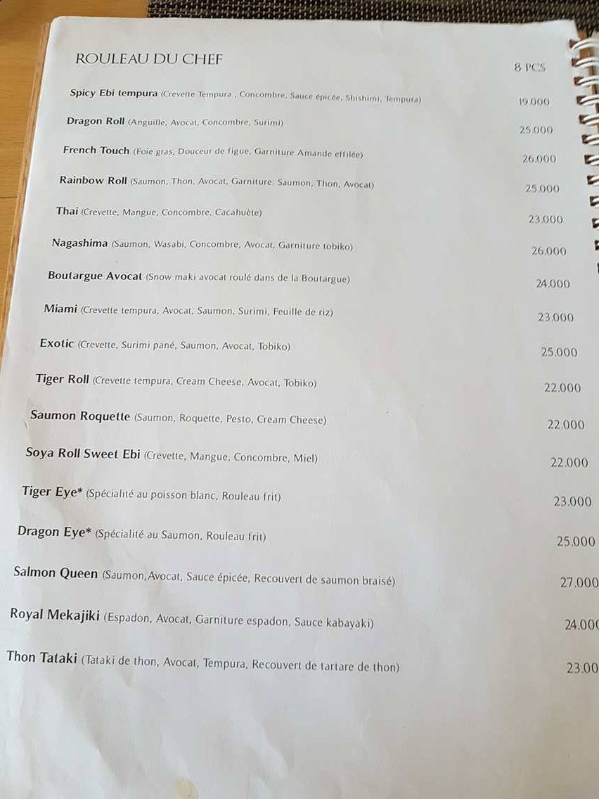 Courageusement, on a donc testé pour vous la carte de Sushiwan Gammarth qui vient tout juste d’ouvrir ses portes sur la route du Relais. Il y a deux formules, la classique, à la carte, vous commandez ce que vous voulez et la formule buffet à volonté où pour 45 dinars vous pouvez manger jusqu’à vous évanouir si vous voulez. Seule contrainte, que nous on a trouvé très intelligente pour éviter le gaspillage, pour chaque pièce non mangée, il vous sera facturé 2 dinars de plus.