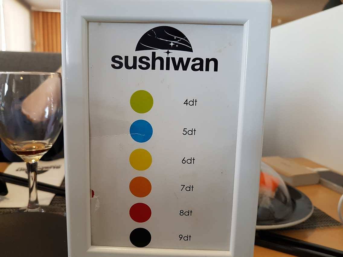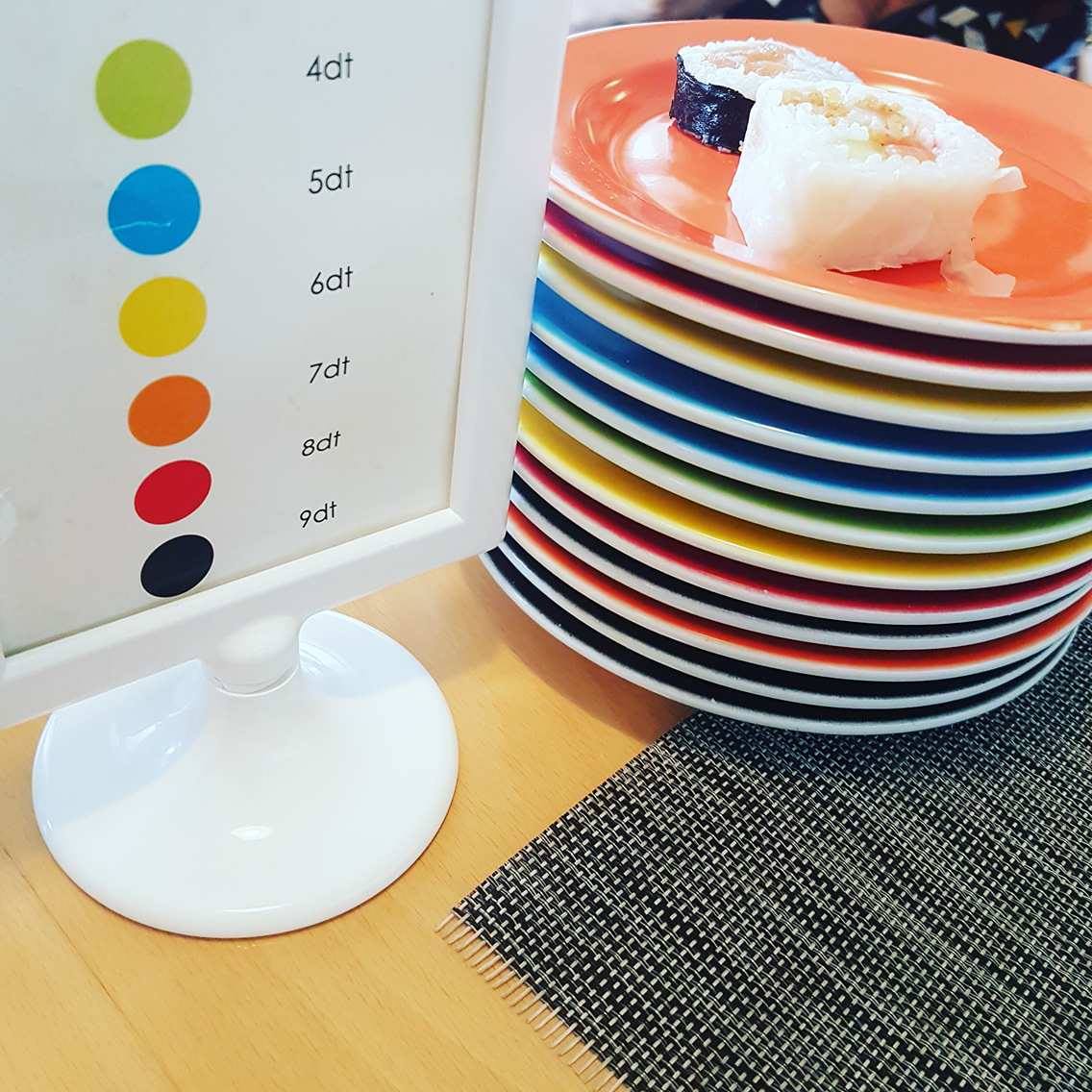 Le système du buffet est très sympa. C’est une espèce de tapis roulant qui amène chaque fois les plats de la cuisine jusqu’aux tables. On n’a qu’à tendre la main pour se servir. Ce sont des petites portions de 3 pièces placées dans des assiettes de couleur différente, chaque assiette correspondant à un prix. Pour l’addition, il suffit d’additionner la valeur des assiettes.