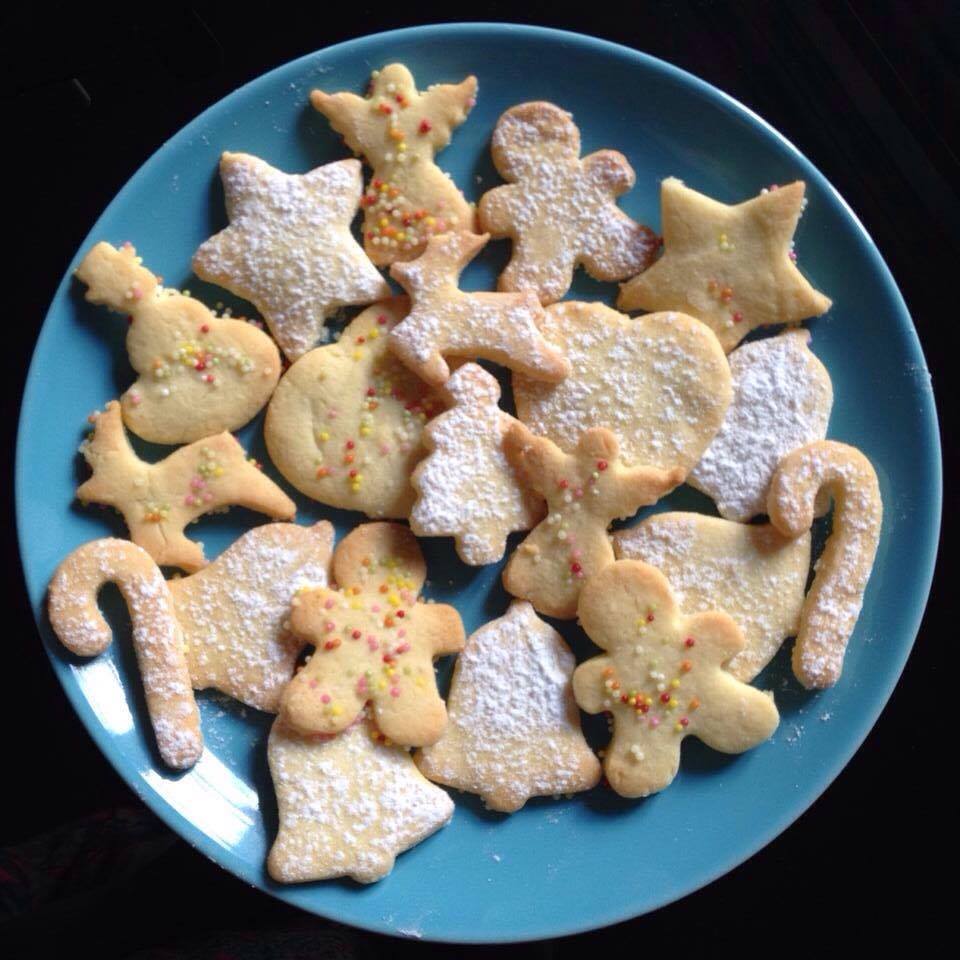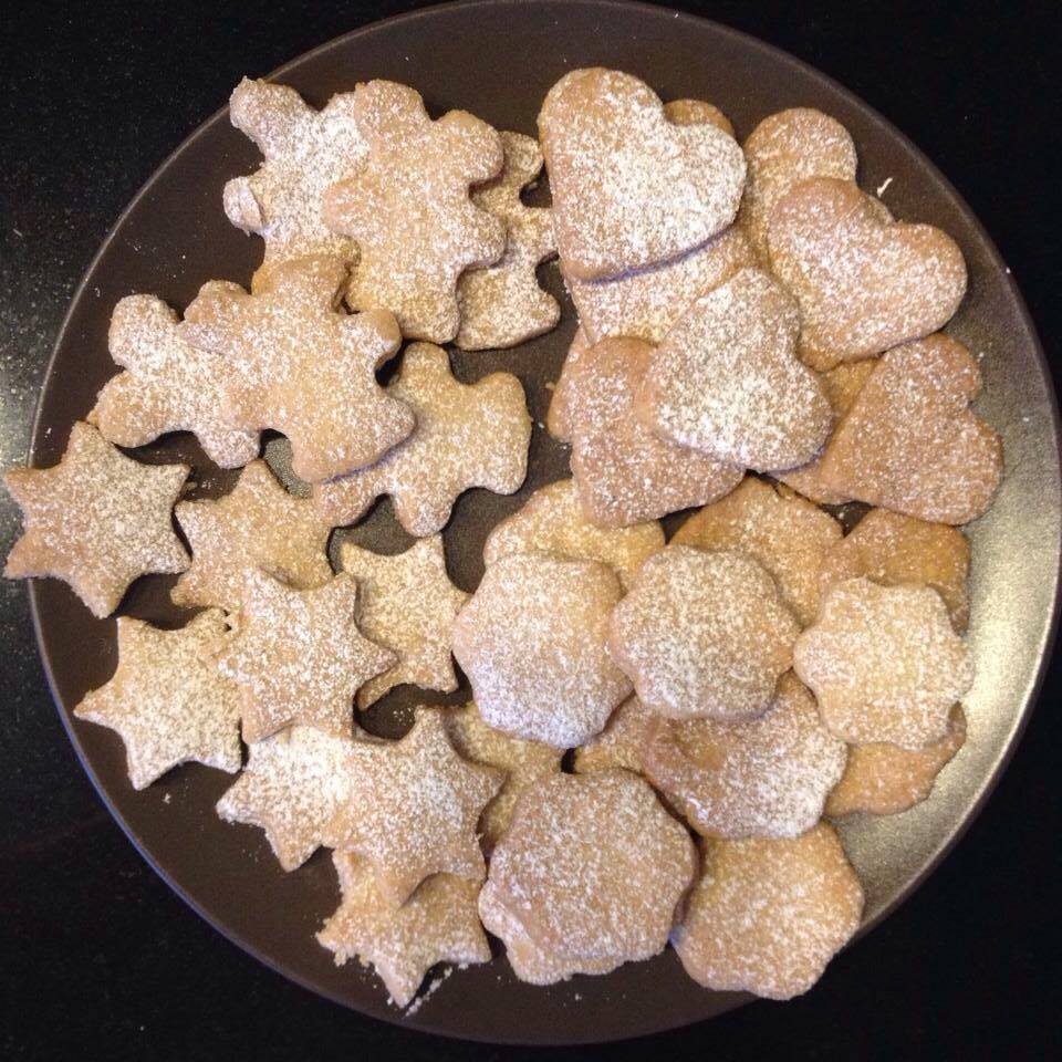 6. Étaler la pâte sur un plan fariné ( 3 à 5 mm ). Emporte-piécer. Cuire 10 min (bords à peine dorés, biscuits pas très cuits).