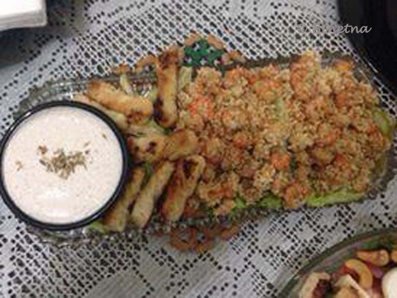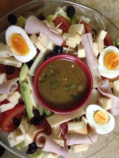 • Salade composée: laitue, feuilles de chêne, tomates, ananas ,fromage, jambon, olives, croûtons, cajou, avocat, œufs et sauce aigre douce.